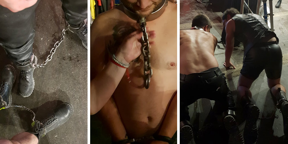 Pokračovali jsme tedy tam kde jsme cca 2 hodiny zpátky viděli subíka jak si obaluje nohu sádrovou dlahou. "Neměli jsme se tam vracet" - asi jsme vypadali nějak málo submisivně, a tak přiskočili dva chlápci v latexu a začali na Jendu nasazovat masivní ocelový obojek na zámek, asi se jim to nezdálo dost, a tak přidali stejně masivní okovy na kotníky. Zaujati tím velkým rozdílem v masivnosti mezi mými pouty na kotníky těmi co měl Jenda jsme si chtěli rozdíl vyfotit (druhá chyba), telefon mi byl odejmut a byli jsme nevybíravým způsobem "složeni" na všechny čtyři. Pánové si celou srandu náramně užívali, a udělaly nám alespoň pár fotek na můj telefon. Celou akci sledovala i Korzetka spoutaná s rukama v bondage vaku a Jendova paní, která nás mohla jediná bránit:) Pánové pak ještě zalaškovali že nás z pout nepustí, ale nakonec se nechali oblomit.