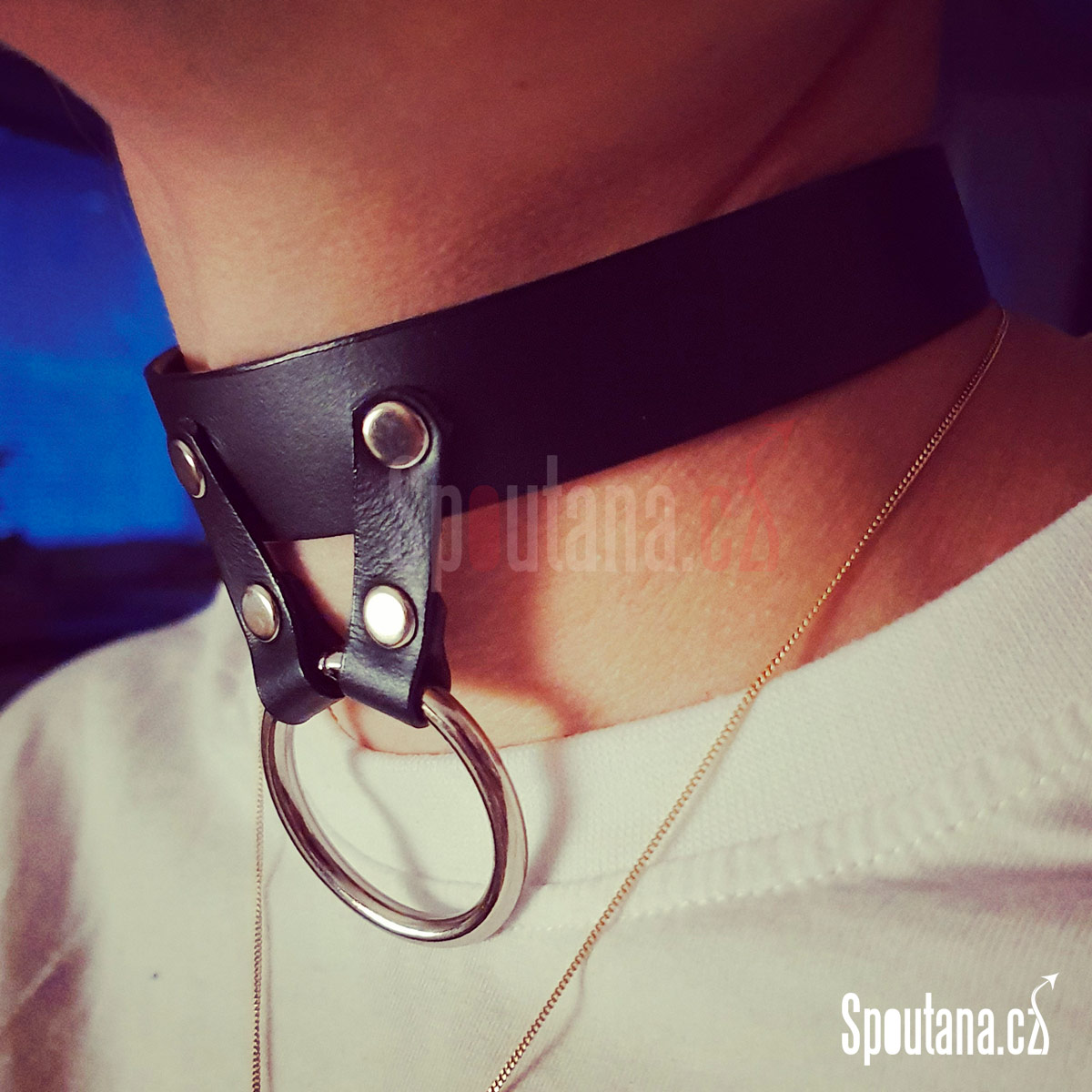 Zajímavý kožený obojek v černém provedení s kovovým kroužkem uchyceným na 2 tenkých proužcích kůže. Menší šíře obojku (2cm) umožní dlouhé nošení bez omezování pohybu. Kroužek svádí hned k několika využitím, zavěsit oblíbený přívěšek, připnout vodítko, a nebo jednoduše nechat být, pokud se držíme hesla "v jednoduchosti je krása".