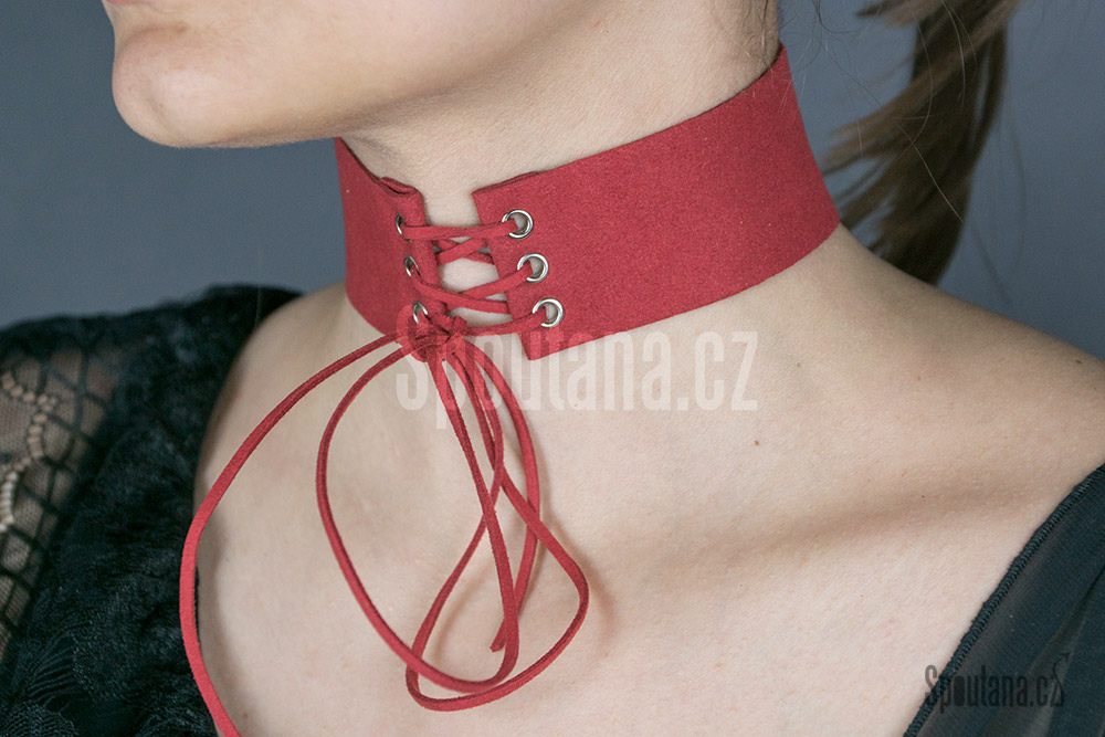 Náhrdelník se šněrovačkou červený. Šněrovačku je možné mít vepředu nebo vzadu, podle libosti.