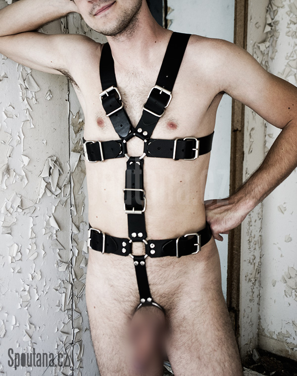 Pánský kožený postroj široce nastavitelný díky množství kovových přezek. Nabízíme dvě cenové varianty postroje levnější s řemeny šíře 25mm, a širší 40mm ( na fotografiích ). Oblast intimních partií je vyřešena pomocí kroužku kterým se prostrčí penis, a dále mezi nohami vede slabší řemen, který se dá dle potřeby utáhnout či povolit. Velice vzrušující postroj ve kterém se se prožít i skvělé milování s partnerkou.