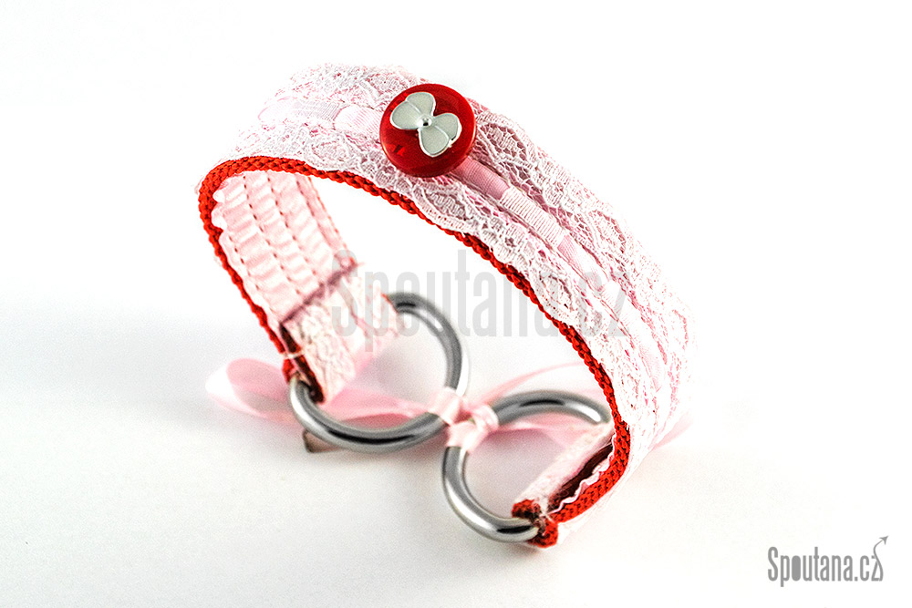 Růžová základní barva doplněná o bílé krajkování po celé délce obojku společně s červenými prvky se jistě zalíbí nejedné subince.