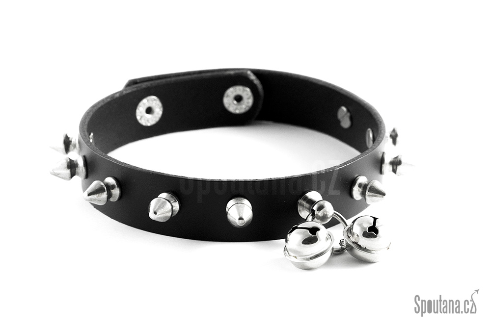 Klasický kožený obojek osazený druky pro rychlé zapnutí na krku. Šířka obojku 2,5cm potěší všechny, kteří nemají rádi vysoké obojky. Po celém obvodu naleznete množství hrotů, uprostřed pak kovové očko na které lze zavěsit oblíbený přívěšek, nebo ponechat dvě dodané rolničky které při chůzi skvostně cinkají a subík se tak bez povšimnutí neprojde.