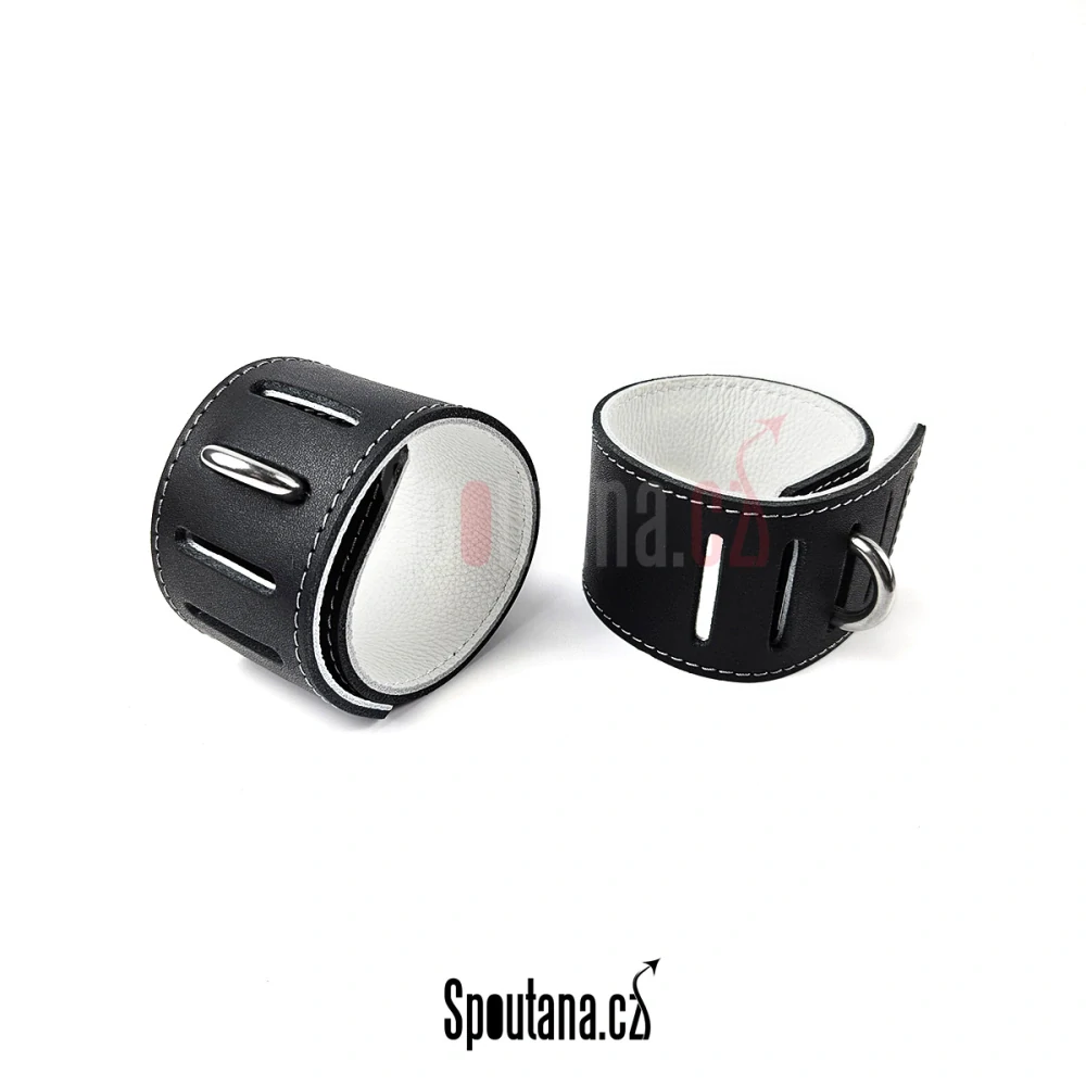 Vrchní masivní černá kůže s kontrastním bílým prošitím v kombinaci s vnitřním podšitím z bílé měkčí kůže jim dodává stylový vzhled, který přidává na autenticitě vašich BDSM her.